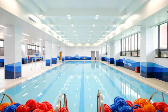 硬件设施 1)综合区:包含剧院、考试中心、话剧音乐教室和行政楼等。 (2)教学区:包含幼儿园、小学部、初中部及高中部教室,图书馆、游泳池、科学实验室、美术教室等专业教室。 (3)运动生活区:包含学生公寓、食堂、室内体育馆、健身房、篮球场、足球场、网球场等。